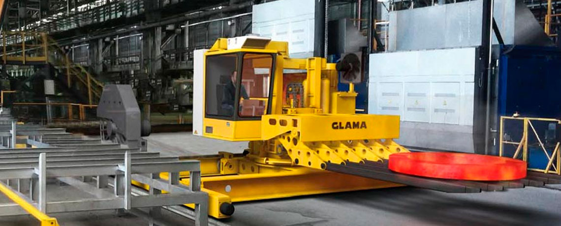 GLAMA charging machines are specifically designed for the transport of cold and hot ingots, discs and rings in open-die forging plants. Various tongs and lever system designs can be adapted according to specific requirements. An additional option is the parallel side shift of tongs.