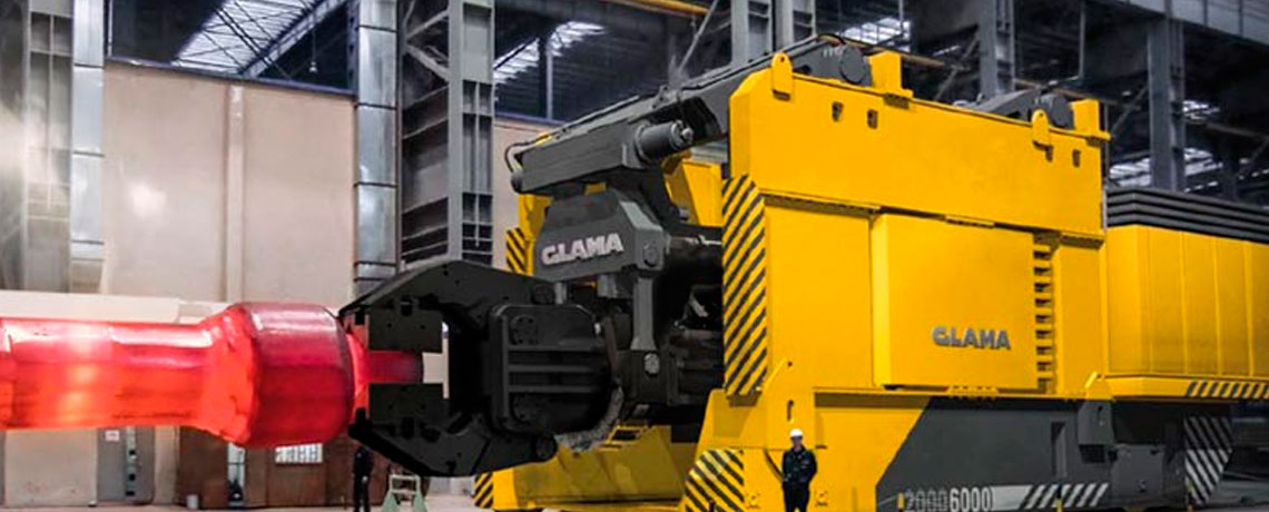GLAMA forging manipulators are specifically designed for the operation at hydraulic quick forging presses and hold all the necessary premises for a full integration into the computer-controlled forging process. Characteristic for the GLAMA manipulator is its unique mass separation between the tongs peel and the main frame with constant backlash-free drive. This enables rapid movements with high precision. Thereby, the unique railbound GLAMA forging manipulator is the ideal solution for a high performance and highly precise forging process, combined with low level operating costs.