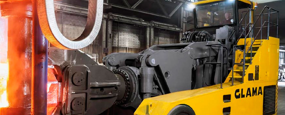 GLAMA charging machines are specifically designed for the transport of cold and hot ingots, discs and rings in open-die forging plants. Various tongs and lever system designs can be adapted according to specific requirements. An additional option is the parallel side shift of tongs.